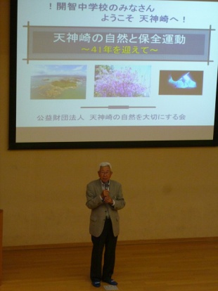 2015年05月27日(水) 中3 < 過去のニュース 中3 天神崎事前学習 今日5、6限目に、6月4日(木)の天神崎事前学習をおこないました。玉井済夫先生をお招きして、天神崎の地形や生物、ナショナル・トラスト運動についての講義を聞かせていただきました。41年前から始まったこの運動では、未来の子どもたちのために豊かな緑と海を残すべく、募金活動、植樹、清掃などを行ってこられたそうです。かけがえのない地球のために、私たち1人1人に何ができるのか、改めて考えさせられました。実際に天神崎を訪れたら、今日のお話を思い出して、有意義な時間を過ごしてほしいと思います。