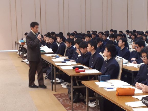 学年主任の藤田先生、生徒指導の福井先生より高校生としてどうあるべきか、どのような人間になりたいかのお話があり、入学して間もない1年生ですが高校生としての自覚を持ちました。また、歌唱指導では小川先生より校歌と讃歌の指導があり、生徒たちは歌詞を覚えつつ大きな声で元気よく歌うことができました。その後の教科学習でも、初めての60分授業でしたが集中力を切らすことなく取り組めていました。1日を通して、周りの友人とも大分打ち解け、とても楽しそうに過ごす姿が伺えました。