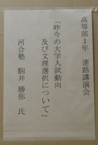 2014年10月25日(土) 高1 < 過去のニュース 高1保護者会 高等部1年生の進路講演会、保護者会が行われました。 進路講演会では、河合塾から駒井勝弥様をお招きし、昨今の大学入試状況と、文理選択についてお話して頂きました。 保護者会では、7月から10月の行事、今後の予定について、報告させて頂きました。 12月には文理どちらを希望するか決断しなければなりません。この2ヶ月ゆっくり考えてみましょう。