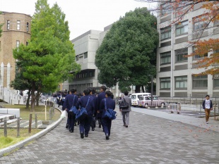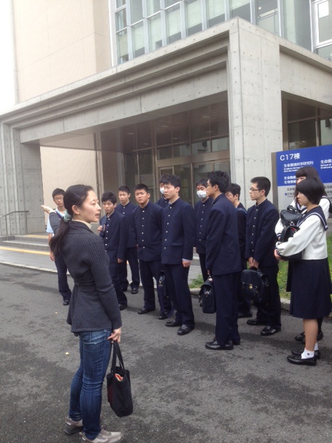大学院生2人に協力していただき、学内を見学させて頂きました。高校とは比較にならないほど大きな敷地に多くの生徒が驚いていました。