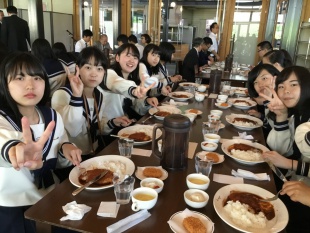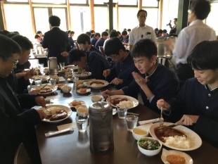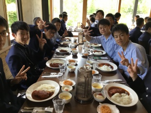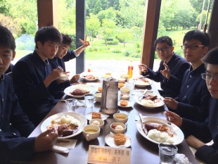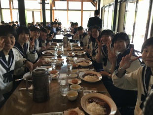 2019年06月09日(日) 高2 < 過去のニュース 高2修学旅行 3 ノーザンホースパークで、関空出発組と伊丹出発組が合流し、全員揃って昼食を頂きました。 予定通り、二風谷のアイヌ博物館へ向かいます。