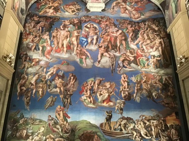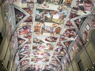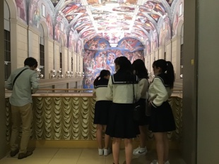入館後、まずはシスティーナ礼拝堂を空間ごと再現したシスティーナホールで、クラスごとに記念写真を撮りました。ミケランジェロの描いた大壁画、天井画の迫力にみんな圧倒されていました。