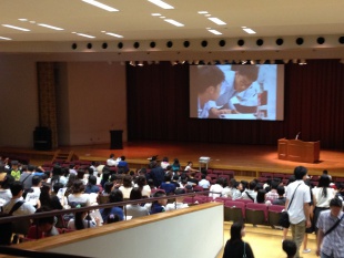 開智ホールでは、教頭先生による「開智がめざす教育について」講演が行われ、新中1を中心とした本校生徒のスライド写真がプロジェクターで投影されていました。