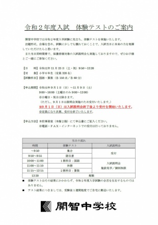 2019年08月21日(水) 入試関連 < 過去のニュース 中学入試 体験テストのお知らせ 11月23日に小学6年生対象に体験テストの実施をします。 このテストではテスト形式や会場に慣れてもらい、入試当日に本来の力を発揮していただけたらと思います。 申し込みに関しては9月1日(日)実施の中学校説明会終了後から申し込み受付を行います。 定員は320名となっております。 たくさんのお申し込みをお待ちしております。