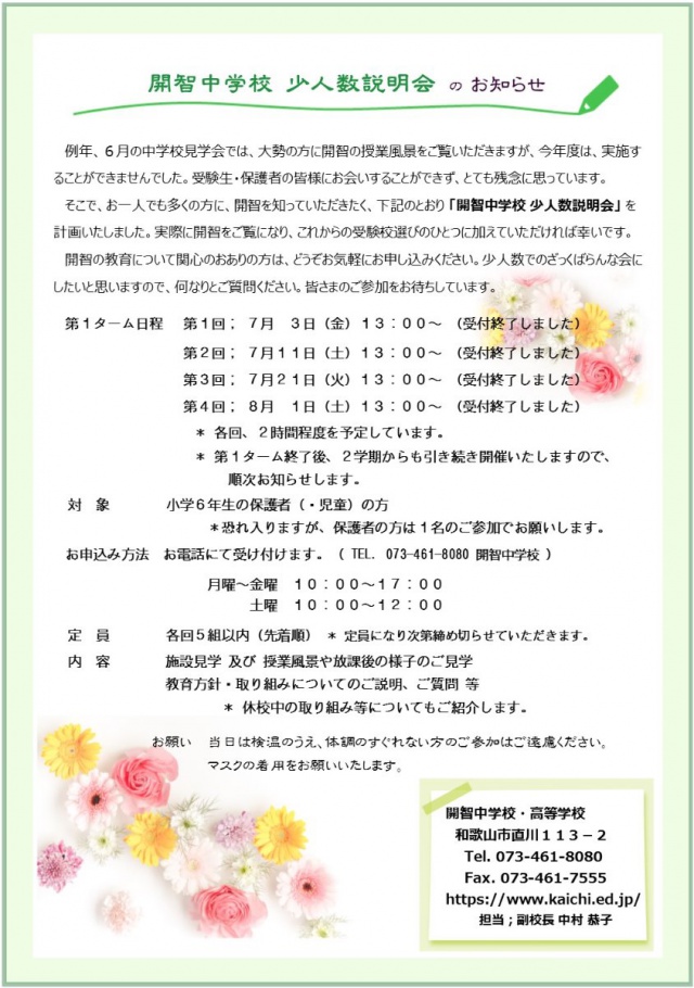 第1タームとしてご案内してきました「開智中学校 少人数説明会」について、 多数のお申し込みを頂戴し、今回の4回分については、受付を終了いたしました。ありがとうございました。