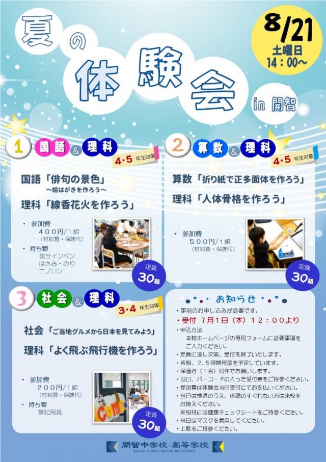 2021年06月30日(水) 入試関連 < 過去のニュース 中学校 夏の体験会 in開智 「中学校 夏の体験会 in開智」のご案内です。 8月21日(土)14:00から、小学校3年生から5年生のお子様方の夏の思い出になるような体験授業を実施いたします。 受付は、7月1日(木)12:00からとなっております。 お申し込みをお待ちしております。