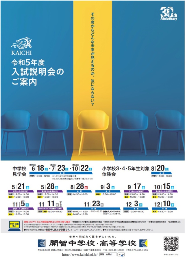 2022年05月26日(木) 入試関連 < 過去のニュース 出張説明会のご案内@御坊市 5月28日(土)に御坊商工会館にて本校の出張説明会を実施いたします。 本校に興味のある小学生、中学生はもちろん、 進路がまだきまっていない方でも、本校の説明会を聞いて進路選択の一助になればと思っています。 まだ申込は可能ですので、本校HPの「入試説明会等申込」ページよりお申し込み下さい。 皆様のご参加をお待ちしております。