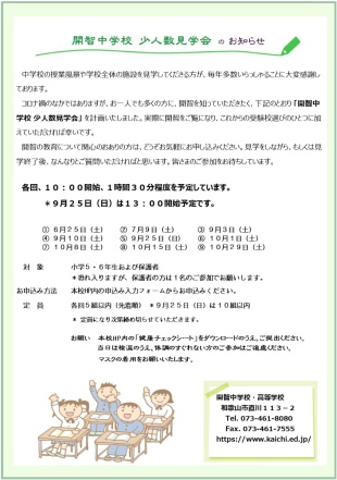 2022年06月16日(木) 入試関連 < 過去のニュース 開智中学校 少人数見学会の実施について(訂正、お詫び) 中学校少人数見学会の日程変更があります。 7月3日(日)に予定しておりました、少人数見学会を中止とさせていただきます。 この日にご予定いただいていた、児童ならびに保護者の皆様にお詫び申し上げます。