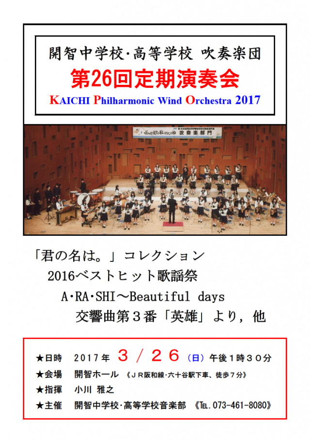 2017年03月05日(日) クラブ < 過去のニュース 第26回 定期演奏会 ●主な演奏会曲目 ・交響曲第3番「英雄」第1楽章(ベートーヴェン作曲) ・古賀政男メドレー ・服部良一メドレー ・「君の名は。」メドレー ・宮川泰メドレー ・小林亜星メドレー ・2016歌謡祭(メドレー) ・A・RA・SHI?Beautiful days(嵐のメドレー) などです。音楽部の生徒たちによる演奏会を、どうぞお楽しみください。