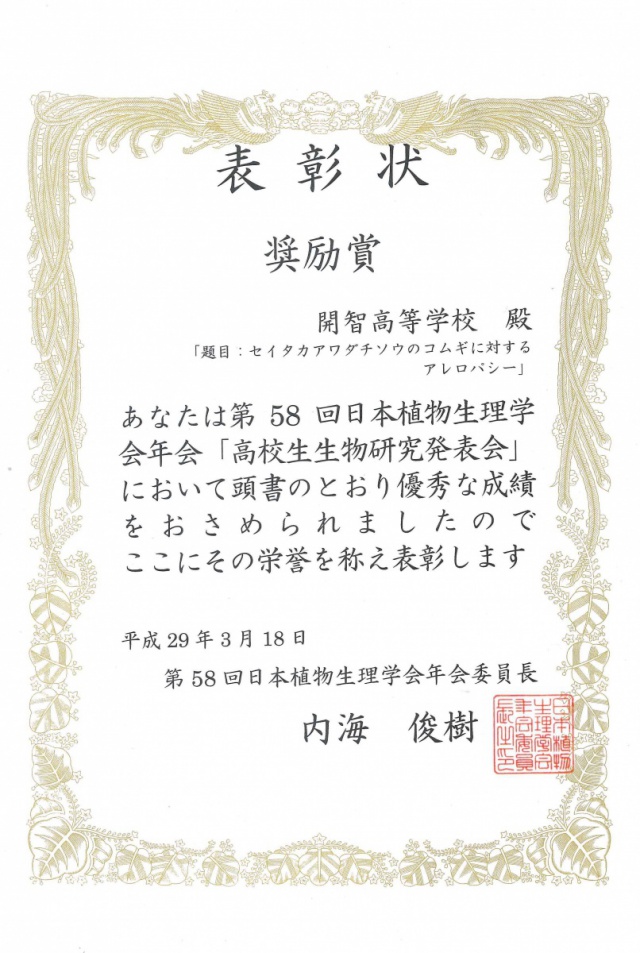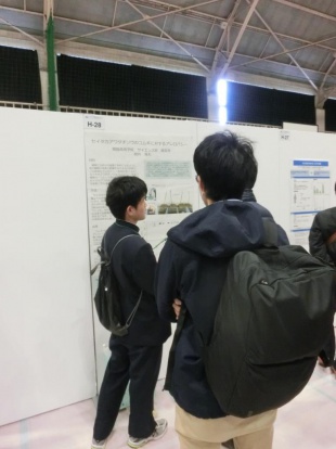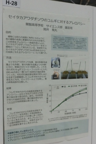本校からは,新高2の筒井飛丸君が,『セイタカアワダチソウのコムギに対するアレロパシー』についてポスター発表しました。コムギには,現在サイエンス部で栽培研究中の「ゆめちから」という品種を用いました。2時間ほどの発表時間のなかで,さまざまな植物の専門家の方々からアドバイスを賜りました。また,他の学校の発表や植物の専門家の発表も大変勉強になりました。
