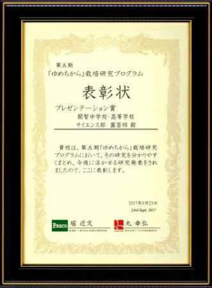栽培・観察・分析・発表練習はとても大変でしたが,最も優秀な発表をした学校に送られる『プレゼンテーション賞』をいただくことができました。この経験を活かし,よりよい研究を続けていければと思います。