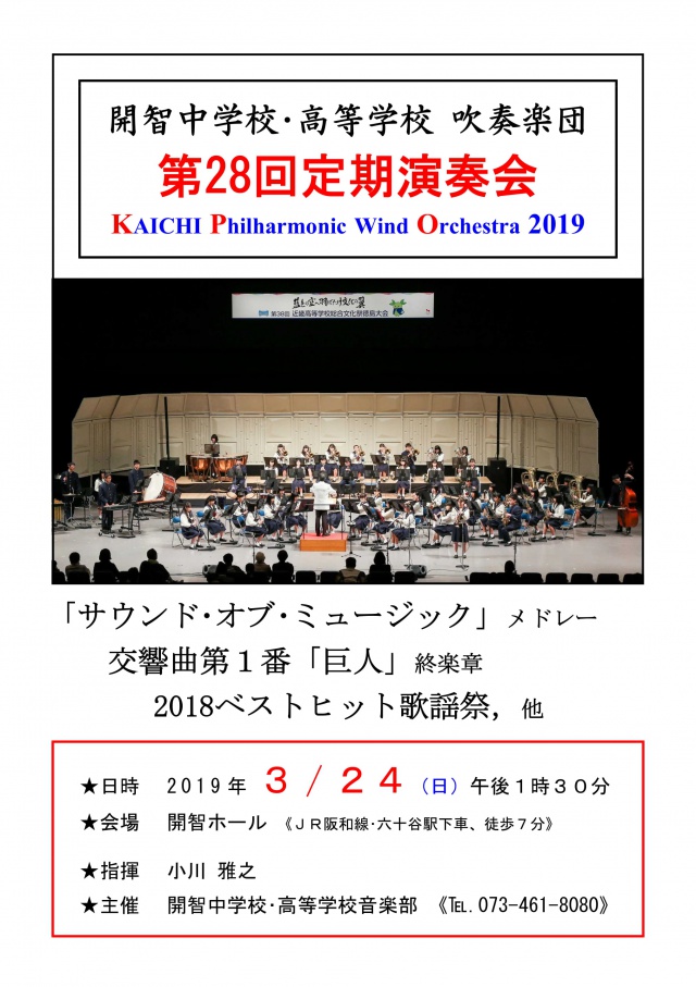 2018年12月17日(月) クラブ < 過去のニュース 音楽部定期演奏会 第28回音楽部定期演奏会のご案内 【日 時】3月24日(日)13時30分 【場 所】本校開智ホール たくさんのご来場お待ちしています。