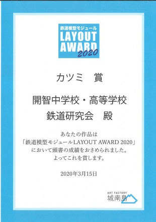 去る 3/15 に行われた「鉄道模型モジュールLAYOUT AWARD 2020」に、鉄道研究会から2年連続で出品しました。今年は新型コロナウィルス感染を防ぐため、鉄道研究会の関係者はコンテスト会場には行かず、作品を送ってご審査いただきました。その結果「カツミ賞」を受賞することができました。皆様のご理解・ご支援に御礼申し上げます。
