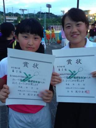 2015年07月13日(月) クラブ < 過去のニュース 和歌山市夏季総体(中学校)ソフトテニス競技 結果 7/11(土)紀三井寺公園テニスコートにて女子個人戦が行われ、 本校3年野尻夢乃と2年矢野真里奈ペアが 5位入賞をはたしました! この結果、7/28(火)に橋本市運動公園で行われる 県大会への出場も勝ち取りました。 また、総体市内大会(男女団体戦)は今週末7/18(土)に つつじヶ丘テニス場にて開催されます。 3年生は最後の大会となります。 県大会出場目指して応援よろしくお願いします。