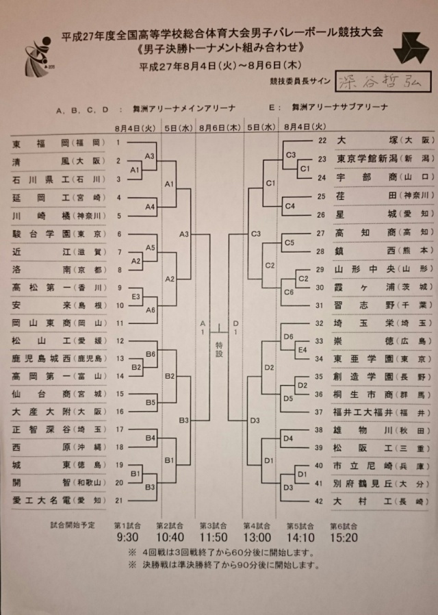 2015年08月03日(月) クラブ < 過去のニュース 【インターハイ】決勝トーナメント組み合わせ決定! 本日18:30より大阪府咲洲庁舎にて抽選会が行われました。 堀江友裕主将が引いてきました。 その結果、明日は… <1回戦> Bコート第1試合(9:30) vs.城東(徳島) 勝てば… <2回戦> Bコート第3試合(11:50) vs.愛工大名電(愛知) ←第4シード校 1戦1戦自分たちの力を出して勝ち進んでいきます! 応援よろしくお願いします!