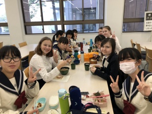 続いての異文化交流会ではしりとりやロシアクイズ大会、カルタ取りを行い、校内見学の後の昼食は、生徒ホールで実際に食券を買って、いつも開智生が食べているメニューを味わってもらいました。本日は、ギムナジアNo2校来校を記念し、特別メニューとしてボルシチランチも登場していました。
