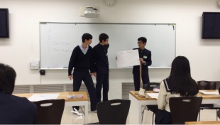 最後は、English Infomercial 。それぞれのチームに、ハンガー、紙の筒、ティッシュの箱、発砲スチロールのボードが割り当てられ、転用アイディアでコマーシャルを作成して発表します。ハンガーをMake Fuwa Fuwa Futon としたチームD、紙の筒をCord Helper としたチームC、ティッシュの箱をDe Tangler としたチームB、どのチームの発表も素晴らしかったですが、優勝は、 発砲スチロールのボードをネコの爪研ぎ ‘Cat’cher としてコマーシャルを作成したチームAでした!