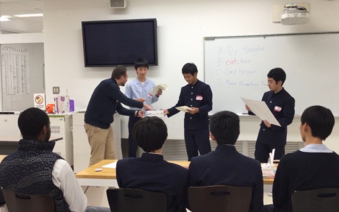 次はEnglish Adventure around Kaichi です。チームで図書室や生徒ホールなど5つのポイントを回ってミッションをクリアしていきます。英語のなぞなぞや英語で道案内、間違い英語の看板の訂正など難しいミッションをチームワークでクリアしていきます。今回、トップでゴールしたのはチームBでした!