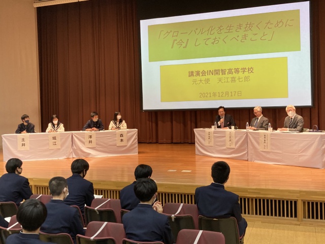 第二部の意見交換・質疑応答の部では、代表生徒から「外交官をしてみて日本や日本人の良いところは?」「多国籍の人達とコミュニケーションをする上で最も大切なこと」「勉強以外で今しておくべきことは何か」などのような質問について、ご自身の経験をふまえながら1つ1つ丁寧に答えて頂きました。