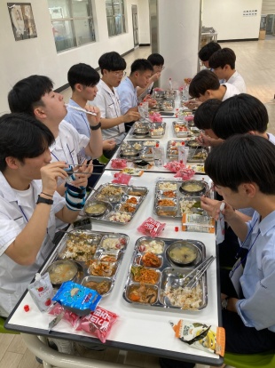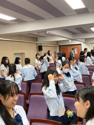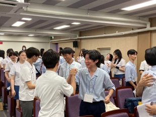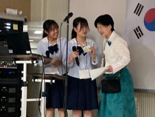2023年05月26日(金) 国際交流 < 過去のニュース 韓国姉妹校訪問 韓国、釜山にある姉妹校に35名の生徒が交流訪問しました。 学校に到着するとすぐに姉妹校生徒たちが大勢で出迎えてくれ、歓迎セレモニーでは、代表生徒による韓国語での挨拶や早野教頭の韓国語スピーチ、両校代表生徒による学校紹介プレゼンなどがありました。 画像は生徒同士でプレゼント交換をしている様子。明日は韓国姉妹校の生徒たちと慶州の世界遺産をまわる予定です。