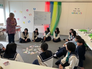 宿題を回収して、オリエンテーションをした後は、2クラスに別れて英語のレッスンです。