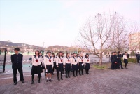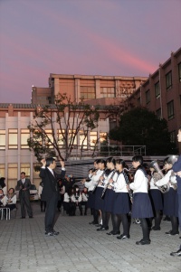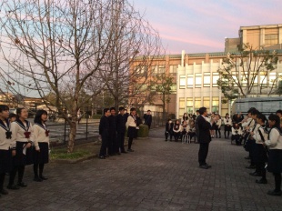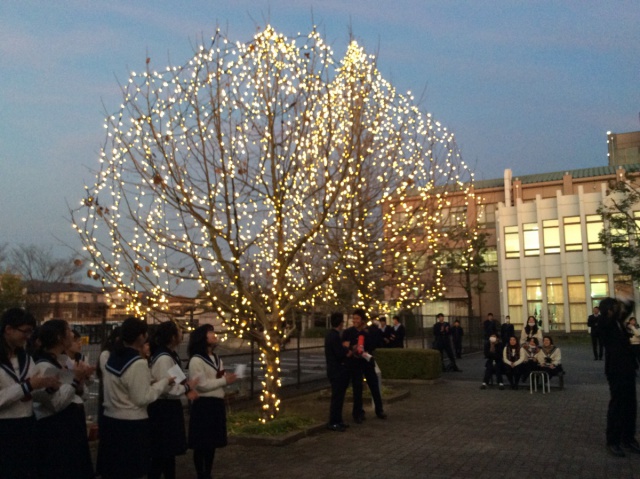 本日の夕刻17時、寒空の下、中学校の玄関前でFriendship Treeの点灯式が行われました。音楽部の演奏とアカペラ部の美しい校歌が華を添えてくれました。中学校生徒会長の田村君の掛け声で、木に灯りが灯されました。留学生が友好の証として植樹してくれた木は、冬の夜空にキラキラと輝いていました。これから子供たちの足元を温かく照らしてくれるでしょう。生徒の皆さん、今日も1日よく頑張りましたね。明日もまた元気に登校しましょう!