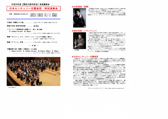 本年度の音楽鑑賞会は、以前(平成26年)に本校で演奏会をしていただいた、日本を代表するオーケストラの「日本センチュリー交響楽団」による演奏会を実施いたします。