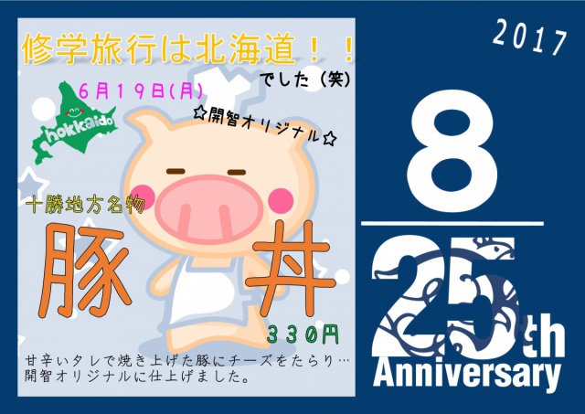 2017年06月20日(火) 生徒ホール < 過去のニュース 食堂企画第8弾「修学旅行は北海道!」 北海道にはおいしいものがたくさんありますね。 その中でも、今回は十勝名物 豚丼を開智オリジナルに仕上げました。