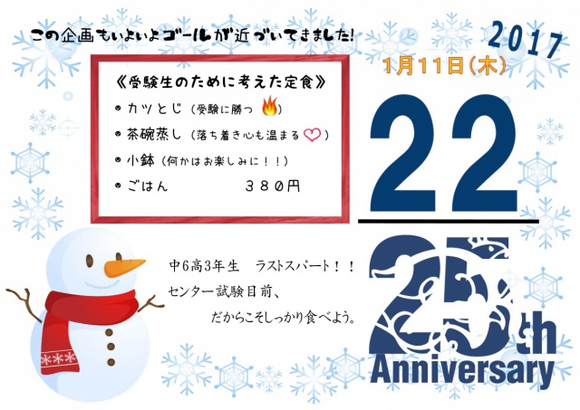 2017年12月21日(木) 生徒ホール < 過去のニュース 食堂企画第22弾「受験生頑張れ!!」 年が明ければ、センター試験目前です。 高等部3年生、中等部6年生の皆さん、体調を整え万全の状態で力を発揮してください! 食堂も皆さんを応援しています。