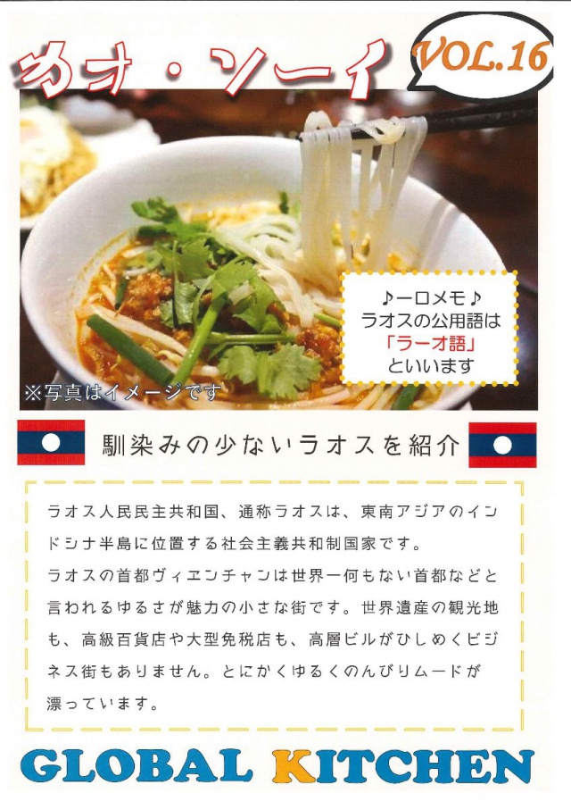 東野先生は、海外経験がとても豊富で普段はふれることのない国をたくさん旅されています。そんな東野先生が生徒の皆さんにぜひ味わってみてほしいと選んでくれた料理が、ラオスのカオソーイという麺料理です。ちなみにラオスの良さは「何もない」ということだそうです。