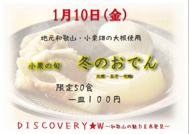 2020年01月16日(木) 生徒ホール < 過去のニュース 食堂企画「DISCOVERY W~和歌山の魅力を再発見~」 今回は、地元の農家の小栗さんから新鮮な大根を仕入れて、この季節にぴったりのおでんにして生徒の皆さんに販売されました。とっても大きな大根に味がしみしみでとてもおいしかったです。寒い季節にはやっぱりおでんですね。受験生の皆さん身体を温めてラストスパート頑張ってください。