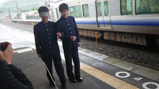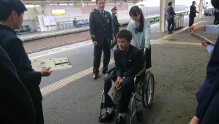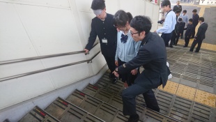 その後、実際の駅構内にて車椅子を体験したり、盲学校の先生方に正しい介助の方法を教わり、アイマスクと白杖を用いて助ける人、助けてもらう人の両方の立場で歩行体験をしました。実際に体験してみると、普段暮らしているなかで自分が障害になると思っていないことでも大きな驚異になる、怖いという気持ちが分かったと学びを発表することができました。