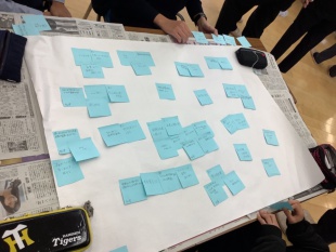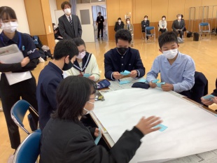 午前中のワークショップでは、小中高生混合グループに高校生徒会長の澤井君が入り、他の生徒は「開智グループ」として参加しました。
