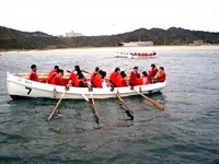 カッターとは、オールをもって漕ぐ小型艇の一種です。全員が力を合わせて、オールをこいでいきます。チームワークが大切ですね。
