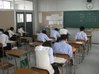 左画像は英検2級の受験会場。2級は筆記75分とリスニング約25分のなかなかハードなテスト構成です。