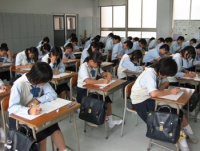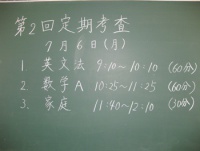 2009年07月06日 | 中等部 第2回定期考査(中学生) 本日から中学生は第2回定期考査です。 試験時間は基本的に60分で、教科によって多少違うこともあります。 生徒達は、開始のチャイムとともに一斉にペンをとり、一生懸命に問題を解いていました。日頃の学習の成果は発揮できるでしょうか。夏休み前の一仕事、頑張ってください。 写真は、本日の中学三年生の試験科目です。 3年1組の様子です。
