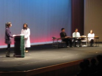 画像は、ア・カペラ部と演劇部のクラブ紹介の様子です。この他にもユニークな発表がたくさんあり、新入生たちは大盛り上がりでした。