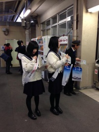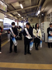 2014年01月28日 | その他 乗車マナー向上運動 生徒会活動の一環で、六十谷駅にて乗車マナー向上運動を行ってきました。 「乗車マナー向上を心掛けましょう!」と、声掛けをしながら乗車マナーについて記載されたティッシュやファイルを配布し、注意喚起を行いました。 活動に参加した生徒会役員は、「とても貴重な体験が出来た。これからは自分自身も率先して乗車マナーを向上していけるように心掛けたい。」と感想を述べていました。