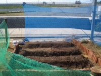 現在、2m×3列のうねができました。まず、運動場の土を耕し、その上に昨年プランターで使った土をかぶせ、さらに新しい野菜培養土をのせてふかふかのうねをつくりました。