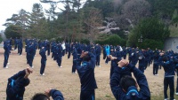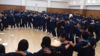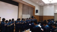 午前の教科学習を終えレストランで昼食をとってから学校ガイダンスです。成績と進路についてお話があった後、校歌・讃歌の練習を行いました。前にバレー部が並び、皆を先導してくれています。