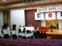 入学許可。担任が生徒を一人ずつ呼名しています。厳粛な雰囲気の中、生徒たちの「はい!」という声が響いています。写真は1-1の呼名風景です。