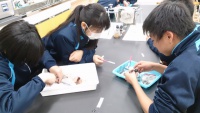 2014年02月21日 | 中等部 中1 スーパー理進コース イカの解剖 本日、中1スーパー理進コースの生徒は理科の時間にイカの解剖を行いました。 食卓では見かけるイカですが、実物を切り開いて内臓を見ることはあまりないと思います。生徒たちは興味津々で、解剖を行っていました。 腕や食腕についている角質環や、口器のカラストンビの観察、内臓のつながり、眼のつくりなどを観察しました。 初めての解剖でしたが、中々手際よくこなしていました。 生物の命に感謝するとともに、体のつくりやはたらきなどを勉強することができました。 明日はこの経験を生かし、ニワトリの解剖を行う予定です。