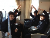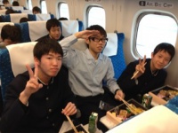 新幹線内でお弁当を食べています。みんな、そろそろ家庭の味が恋しそうです。新幹線は、修学旅行を振り返りながら楽しい話題で盛り上がるみんなを乗せて大阪へと向かっています。楽しかった修学旅行もあと少し。
