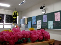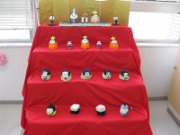 1年生の展示は、季節ごとの風物、行事をイメージしたものを作成しました。1年2組は『春』。教室の入口には段ボールで作ったしだれ桜やソメイヨシノがお出迎え。写真は紙粘土で作られたかわいい雛人形。ちゃんと、笛や太鼓も持っています。
