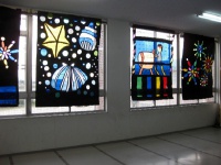 こちらは、1年4組の『夏』模様の教室です。写真には写っていませんが、教室のまん中には、ブルーシートの上にサーフボードが置いてあります。窓を見ると、貝やお祭り、花火の涼しげなステンドグラス。夏が過ぎたばかりなのに、来年の夏が待ち遠しくなってしまいますね。