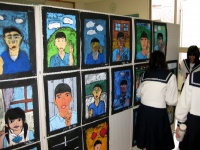 こちらは、美術の授業で作った中2の生徒達の作品です。木版画で自画像を描きました。みんな、自分の特徴を掴んでいて、力作揃いでしたよ。