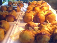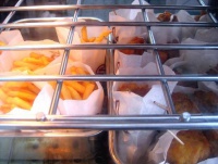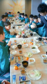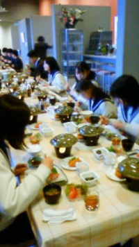 夕食の様子です。たくさん歩いたため、お腹が空きましたね。バイキングなので、自分の好きなものをお皿に取って食べています。ホステリングで友達と交流を深めたようで、笑い声も聞こえてきました。