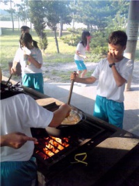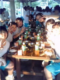 午前中、勉強をしたあと、午後は飯盒炊飯です。メニューはカレーです。飯盒炊飯は初めてという生徒も数多く見られ、生徒は意気揚々としています。材料の皮むき、釜戸での火おこし等、自分たちで行います。じゃがいもの芽はきちんと取り除いてくださいね。写真は、カレー鍋をかき混ぜている様子です。煙がすごくて、その場にいるのだけでとても大変でした。