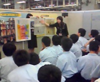 最近の新聞はとてもカラフルな面も多いですよね。ここでは新聞のカラーについて説明をしていただきました。なんと、藍色、赤色、黄色、墨色のたった4色からいろんな色を生み出せるのです。きれいなカラー印刷が出来上がっていく様子をみた生徒達は、思わず拍手をしていました。お土産に出来たての夕刊、ボールペン、そして記念撮影をした写真を載せた新聞をいただきました。