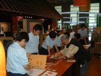京都市内の京友禅工房に到着しました。京友禅ハンカチを作ります。好みの色のハンカチに型紙を当て、色を染めていきます。さて、どんなふうに仕上がるでしょうか。